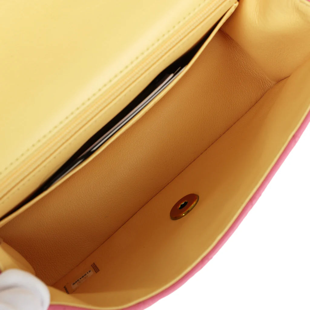 This Chanel Mini Rectangular Flap Bag is of pink lambskin with iridescent rainbow tone hardware, a front flap with CC turnlock closure, half moon back pocket and an interwoven iridescent rainbow tone chain link and pink leather shoulder/crossbody strap.