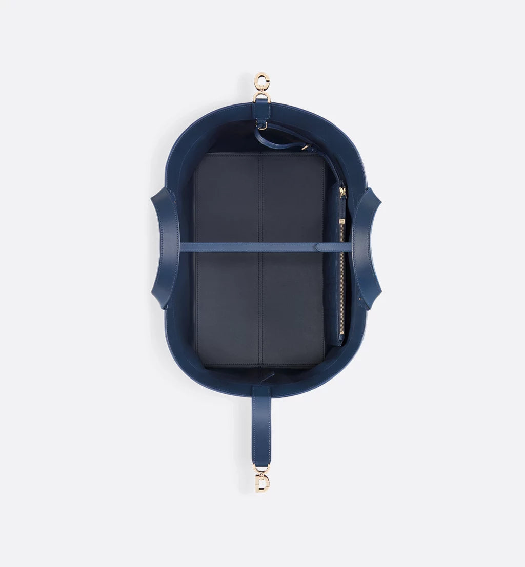 The Dior Toujours bag is distinguished by a casual and practical design. Crafted in deep ocean blue calfskin with Macrocannage topstitching, it showcases a spacious interior compartment with a matching pouch to organize the essentials. Its thin leather strap closure keeps items secure while the D of the CD Lock clasp twists to alter the sides and enhance the bag's silhouette. The leather top handles can be adjusted using the small notches so the large bag can be carried by hand or worn over the shoulder.