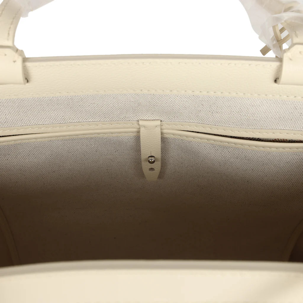 The interior is lined in white natural canvas and has one interior floating pocket on the front wall.