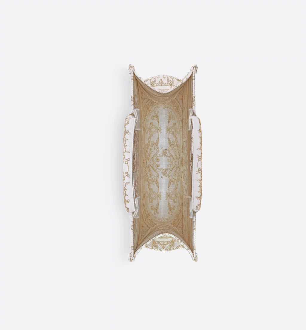 The Dior Book Tote has become a staple of the Dior aesthetic. Designed to hold all the daily essentials, the latte and gold-tone style is fully Cornely-embroidered with Pietro Ruffo's Dioresque Stella motif, offering a new take on the House's lucky star in a delicate architectural framework inspired by the grotesque paintings of ancient Rome. Adorned with the Christian Dior Paris signature on the front, the medium tote exemplifies the House's signature savoir-faire and may be carried by hand or worn over the shoulder.