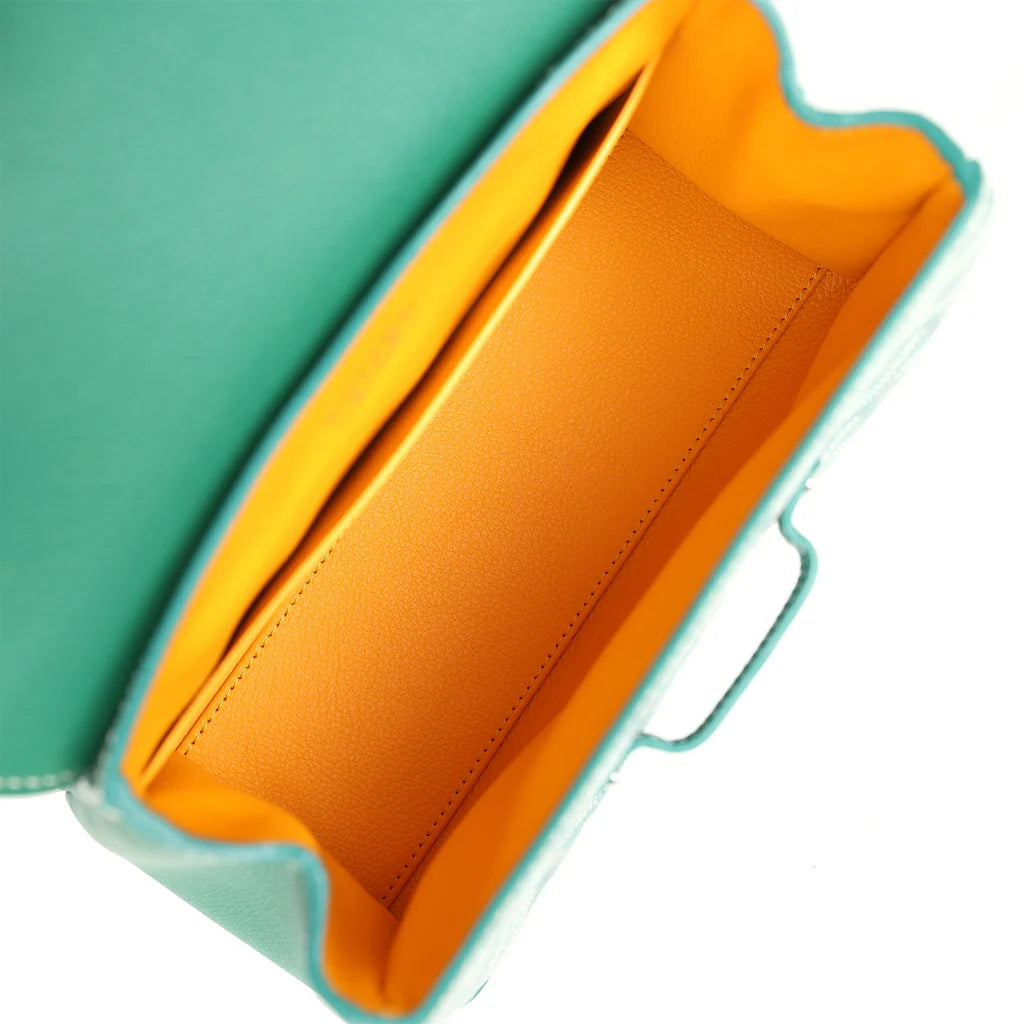 This Saigon Souple Mini is of green calfskin leather and goyardine canvas with palladium hardware, features front flap, top handle, removable strap and tonal stitching.