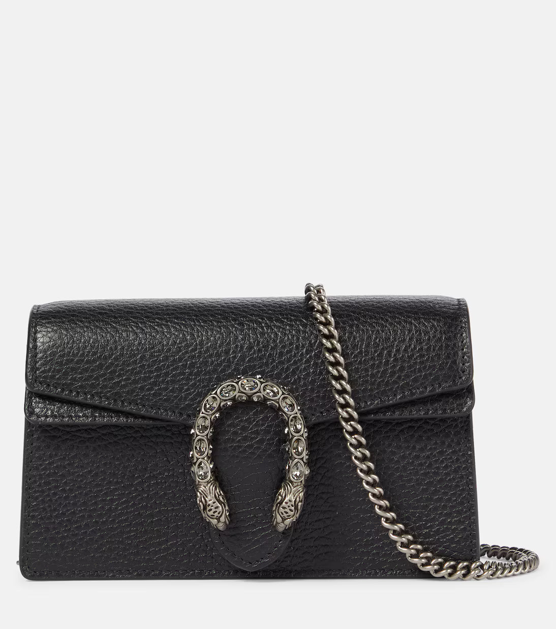 Gucci's iconic Dionysus shoulder bag is re-imagined here in the Mini size. Crafted in Italy from grained black leather, the structured silhouette is defined by its engraved tiger head spur. It can be carried by the removable chain shoulder strap or as a clutch; or, you can attach it to a larger bag via the inner key ring clip.